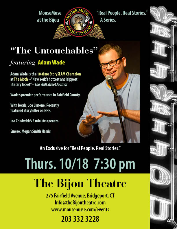 October 18, 20112 at The Bijou www.thebijoutheatre.com. will be absolutely thrilling for, Joe Limone and Ina opening the evening, onstage for Adam Wade, www.Adamwade.com. Adam is the 18 time StorySLAM winner at the “Moth.” Adam is like the Garrison Keeler of the Northeast. Homey, adorable and humble. He’s able to make fun of himself. It’s a gift that has landed him nighttime TV gigs in Storytelling. The show will feature Ina doing two 8 minute stories, Joe doing a “clliff serialized story for 12 minutes, and Adam Wade is his incredibly likable way will make you stop, look, listen and care. He’s a rare bird. Vulnerable and funny. Mark your calendars. Adam has never been around these parts. This is big stuff for MouseMuse. Yay!