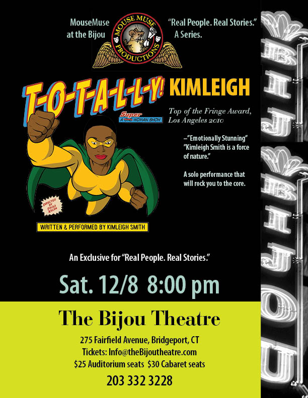 TOTALLY Kimleigh made a debut in New York a couple of years ago at the Fringe Festival. Every critic, including the Wall Street Journal raved. She moved to L.A. where she is a sell-out and well-known talent who has been on the “Mentalist” and other TV Shows. On DECEMBER 8, we bring Kimleigh to The Bijou Theatre, www.thebijoutheatre.com for a jaw dropping solo performance that will have you laughing, crying and applauding the miracles of humanity. This is not just a woman’s show. This is a life-transforiming experience. See the trailers and make sure you get there. There are high wire moments in www.TotallyKimleigh.com