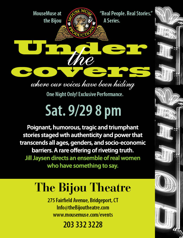 The first show being presented at The Bijou Theatre by MouseMuse Productions will be on September 29, “Under the Covers, Where Our Voices Have Been Hiding.” This is a one-time exclusive performance by a talented ensemble cast of mostly Fairfield County women who range in age from 30 to 81. The show was first produced by Jill Jaysen at the Seabury Center in Westport, last year and played to rave reviews and sell-out crowds two nights in a row. Each of the cast members has written their own story as if they were sharing in their diaries.